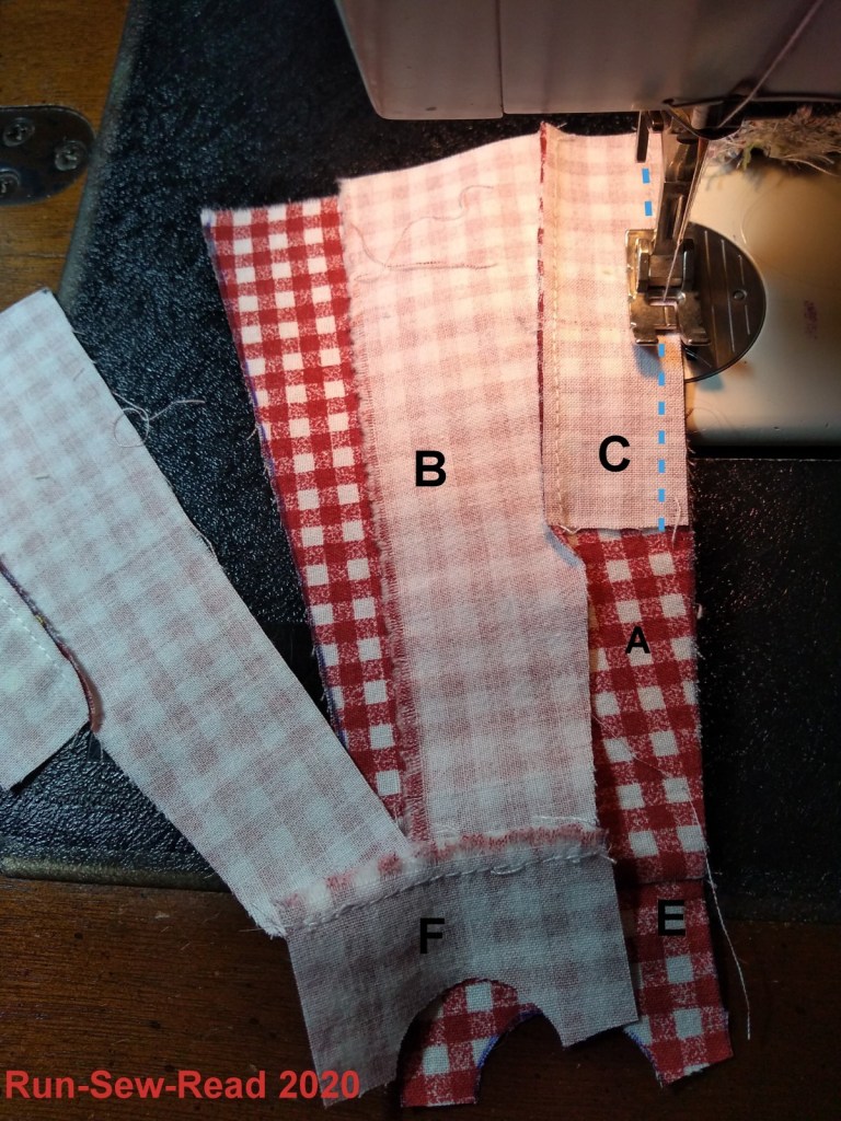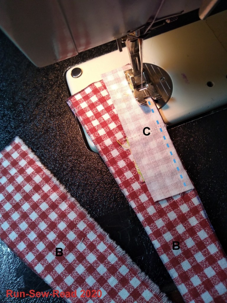 Join Side Sections (C) to Front (A), right sides together. Again, catch the pocket side in the seam.