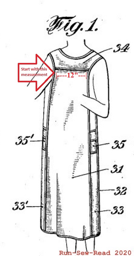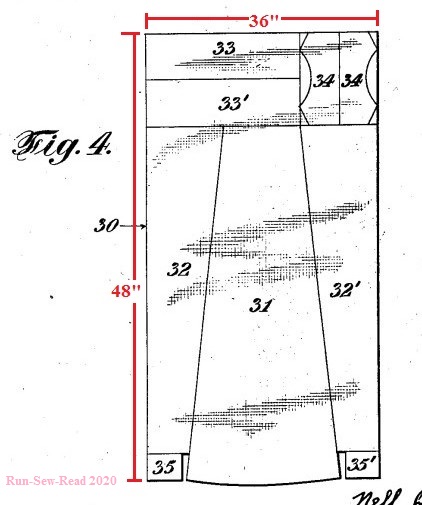 The 1925 patent diagram shows a single layer of fabric. For my apron, I concluded the fabric needed to be 48″ long and 36″ wide (1 1/3 yds x 1 yd).